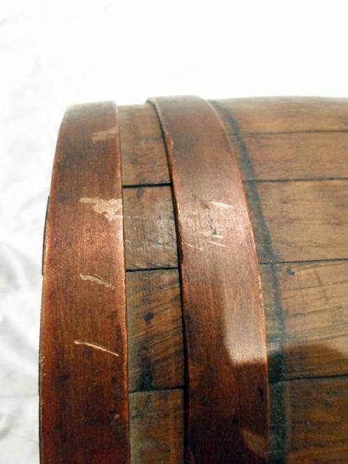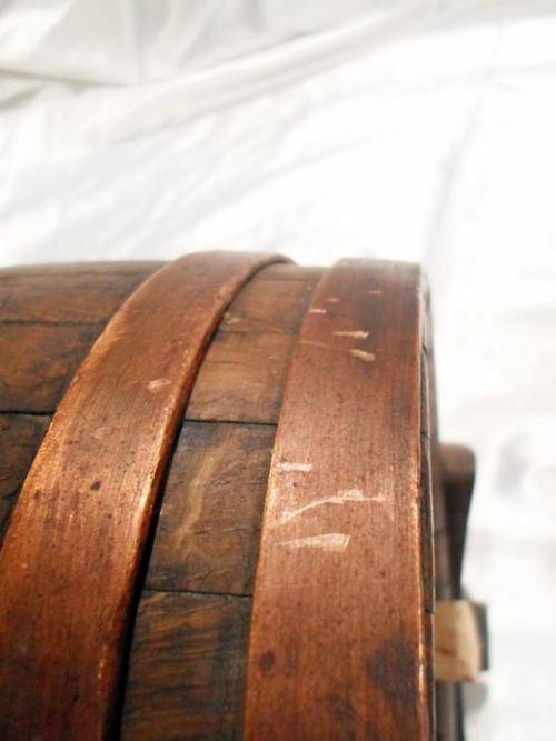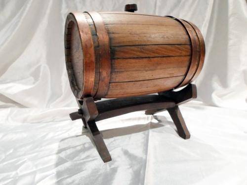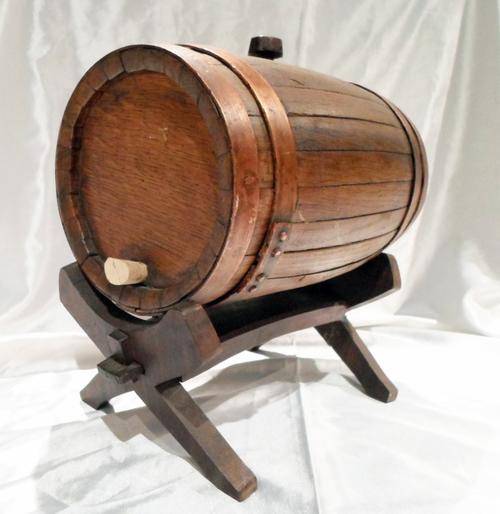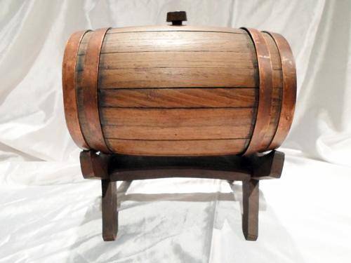 An unique oak barrel with copper fittings on a stand altogether it is 24cms x 16cms x 25cm high.The barrel is on a wooden stand. Bid now!!