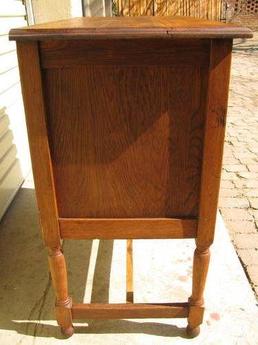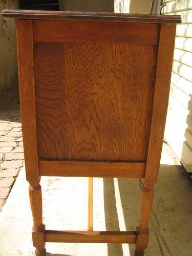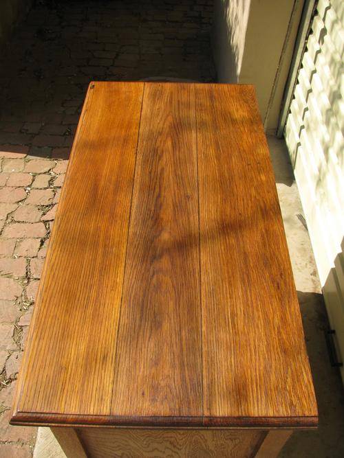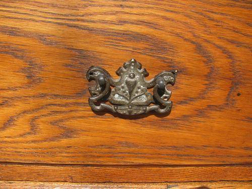Exquisite quality chest of drawers in solid medium oak. The top has a small burn mark and the drawers a few scratches. The handles are not original. Size 87cm high, 92cm wide, 46cm deep. Sorry for the upside down pics, somehow happened during uploading.