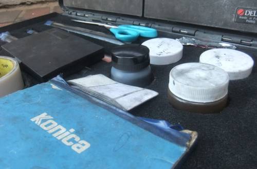 Obsolete SAP fingerprint investigation bag with a few tools of the trade. Bag is well used and full of investigative history. Tools include two brushes, old SAP folios used to exhibit lifted prints on,some development agents like dragons blood and silver powder, scissors, ink pad and latent lifting tape.