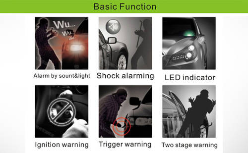 • Alarm alert by ultrasonic sensor, shock sensor