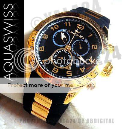 This is the highly recognized Trax 18k Gold pl model from AQUASWISS, this model comes with a flawless sapphire crystal , screw down back, unidirectional diamond rotating bezel , black rubber and steel combination bracelet , highly fluorescent markers, comes equipped with a screw down crown , a diving capacity of 330 feet (100 meters ), 18k gold pl stainless steel block construction. The camera does not capture the beauty of the dial and watch.