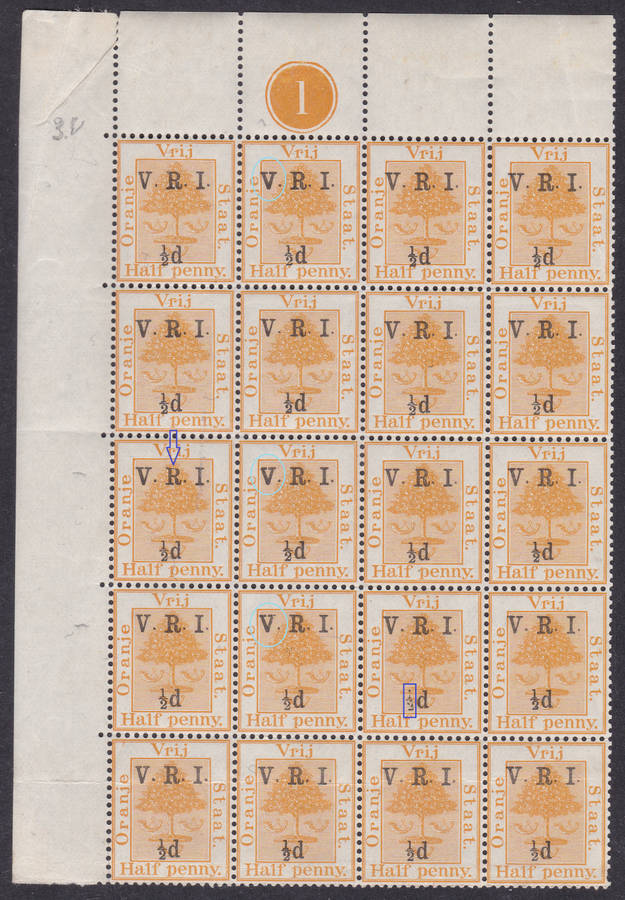 SACC59/69 : ½d ON ½d ORANGE MARGINAL CONTROL BLOCK OF 20 WITH VARIETIES - SEE SCANS