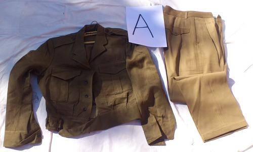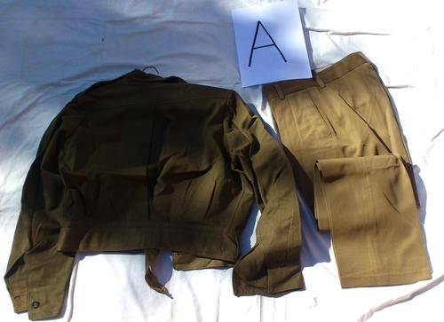 Lot A Old Army Bunny Jacket and Long Pants. Both the jacket and pants are in good condition and were not worn often. Some buttons missing. No size is indicated, but I would estimate the pants and jacket to be both medium. The jacket is labeled "Battle Dress Blouses Whipcord - 365 - Ensign Ltd - 1964". The pants are lighter in colour than those in Lot B also on offer. I do not know if the pants match the era of the jacket. Previous owners name written on inside label of jacket. The jacket has no badges or insignia. Signed for postage via the Post Office and at the buyers own risk will be R45. Please allow enough time for the 3 photos to download.