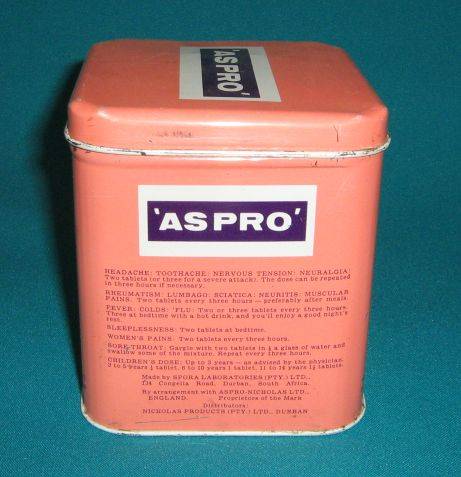 MARKED: "ASPRO, FOR HEADACHE, TOOTHACHE, NERVOUS TENSION, NEURALGIA"; "MADE BY SPORA LABORATORIES (PTY.) LTD. DURBAN, BY ARRANGEMENT WITH ASPRO-NICHOLAS LTD. ENGLAND"