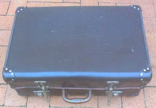 Description: Old BROWN SUITCASE WITH ADJUSTABLE HINGES (lid can go higher or lower, depending on amount of luggage). No manufacturer's name. Condition: Good used condition. Locks and hinges in working condition (a bit rusted), no holes, no cracks or major scratches. Top (where handle is), is a bit wobbled. Approximate size: 560mm wide x 370mm deep x 200mm high (but is adjustable). Other: Color of real item could differ from that depicted on picture. Please regard pictures as part of description of item.