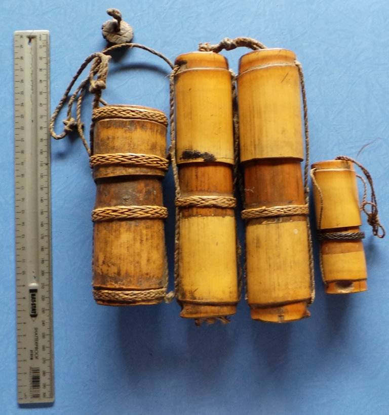 4 x old bamboo quivers (holders) for darts. (There are no darts included) I would think that they were used to carry darts and arrows for blow guns. The smallest is 100mm when closed and the largest 200mm when closed. They could be from the Indonesian Islands or Philippines or maybe elsewhere, I am not sure.