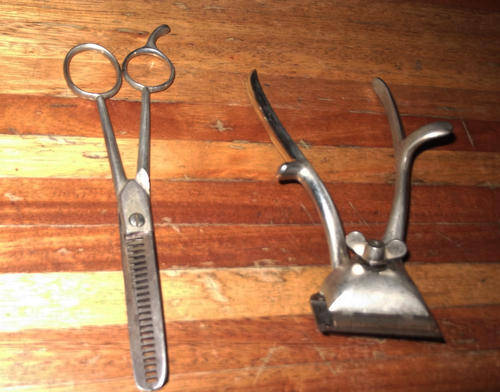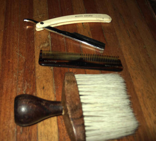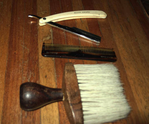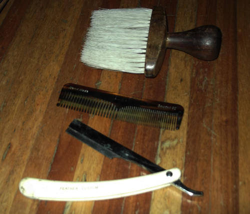 Here are 6 items in the lot. Including a strop, brush, scissors, clipper, cut throat and comb.Strop is made by Boots,Eng.