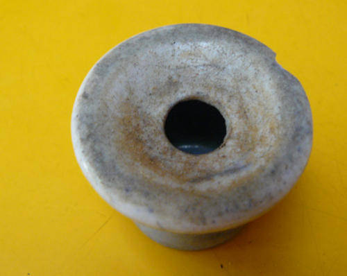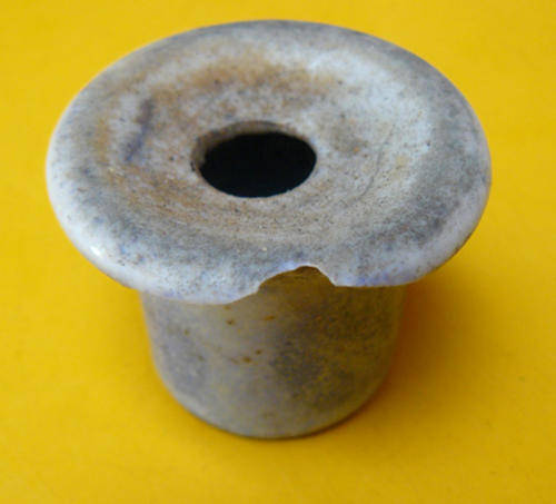 Old ceramic desk inkwell for school desk. It is 45mm across the top. There is a small chip to the side of the top section. It also shows considerable signs of wear.