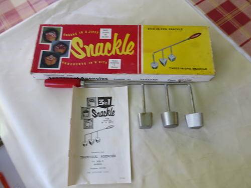 OLD DOUGH SNACKLE IRON - THREE - IN - ONE SNACKLE - 340 MM LONG IN ORIGINAL BOX AND INSTRUCTION