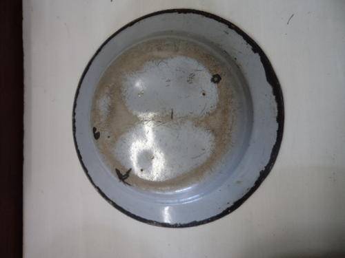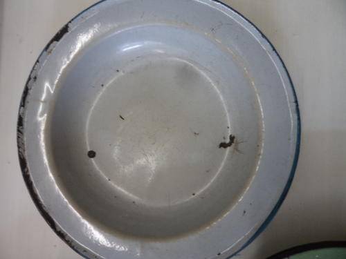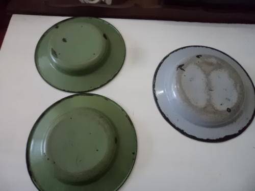Old enamel plates. 3 available at R10 each. width of the 2 green plates is 22cm. the blue one is 24cm.