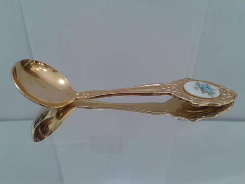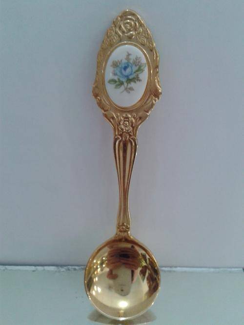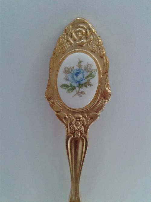 Blue Rose painted on an oval enamel button on a yellow gold plated spoon.
