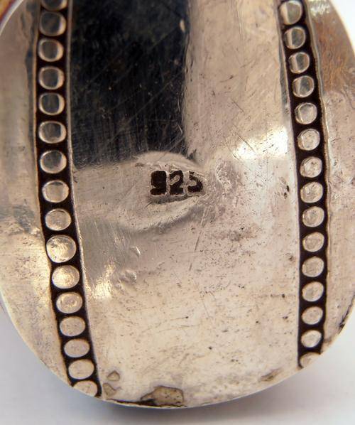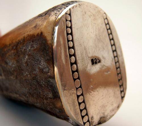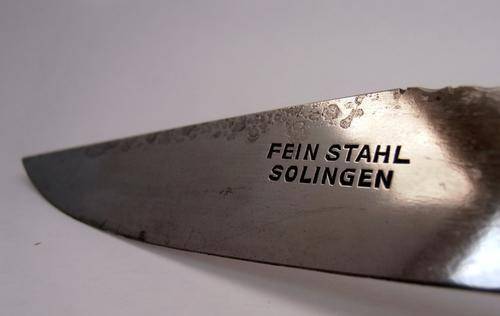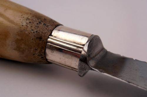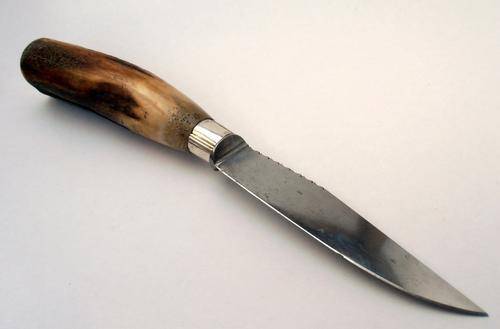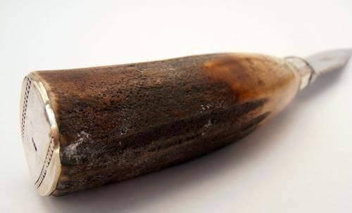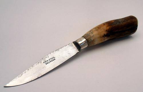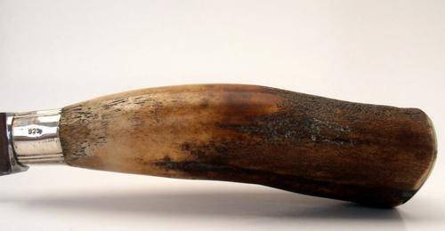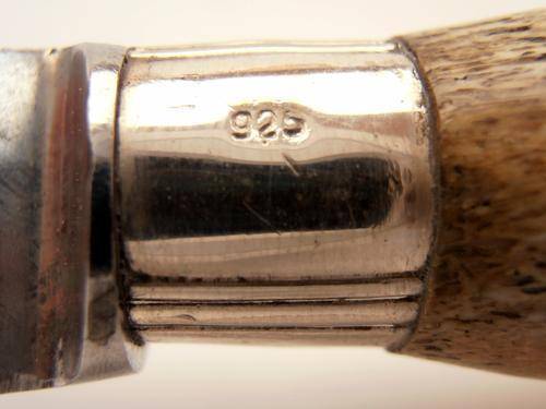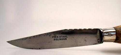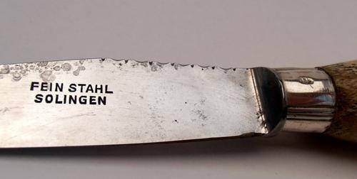 Old German knife marked " Feinstahl Solingen". The thick, heavy handle is made of a stag/deer antler and it has a 925 silver bolster and a 925 silver plate decoration. Length is approximately 22cm.