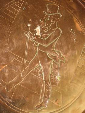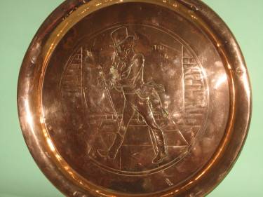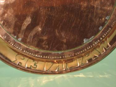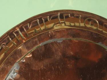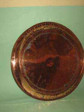 An Old Johnny Walker Copper Tray, Large and Heavy. About 32cm in diameter. Shows welding at places serving as reinforcement. Has some kinks and dings with age and use (Character!!!). Main photo at 1 o'clock shows a small cut and hole in the tray.
