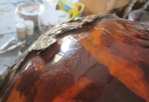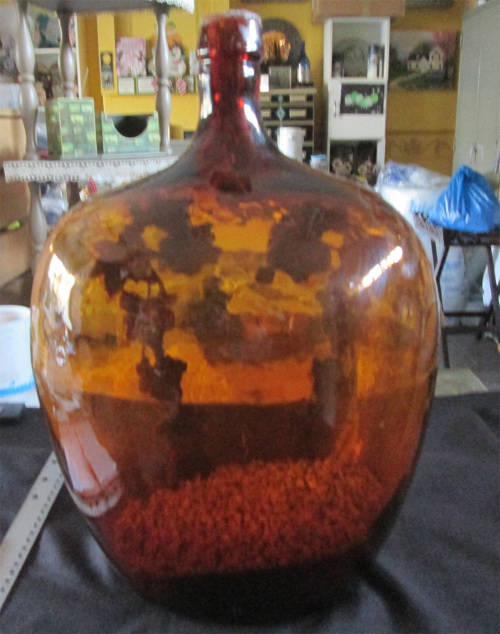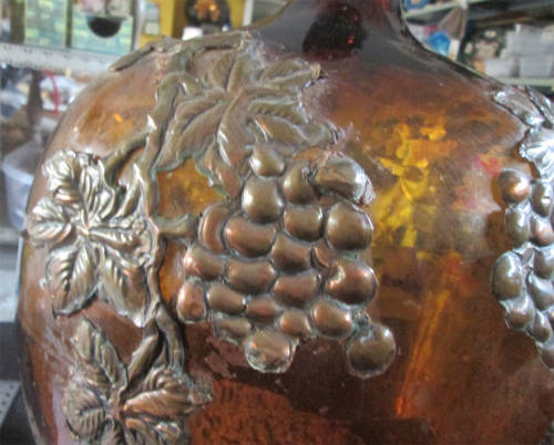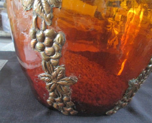 Old Large Amber Coloured Glass Bottle with Pewter Work and Stones inside.