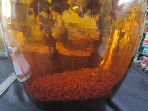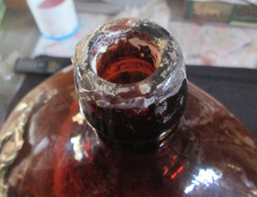 Bottle was used for candles and there are remnants of wax at the top of the bottle.