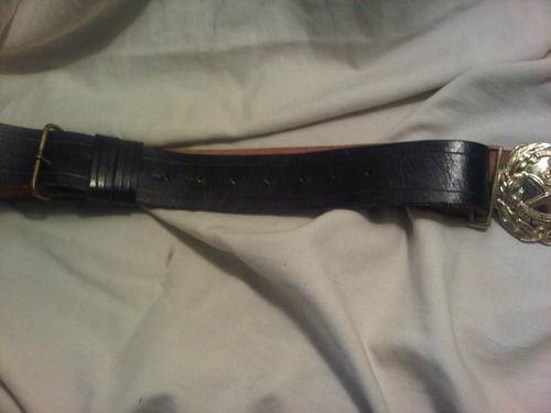 Perfect condition, the leather is great and then there is a mark of the previous price of this item. There are 2 lines pressed into the front of the belt for regulation decoration. The brass is in great condition and a cleaning may be needed. Length : 97.5cm but can still be adjusted for longer or shorter.