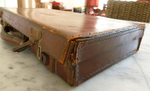 A lovely old leather masonic case or possibly an instrument case with baize lined interior. The case measures 43cm by 21cm by 6cm. It is in good used condition, some stitching on both sides of the flap requiring rework, and some rust to the metalware, but the hinges work well and the handle is still intact. Pretty vintage item.