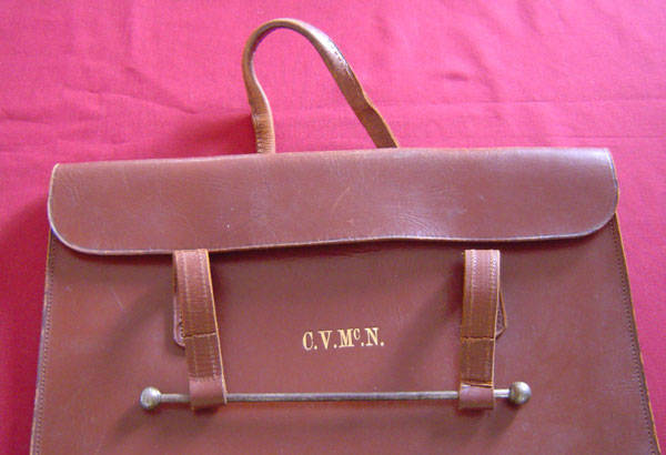 Lovely old leather music case monogrammed CV McN. Case measures 35cm by 29cm and is in good used condition, with some loose stitching on the handle. Attractive item.