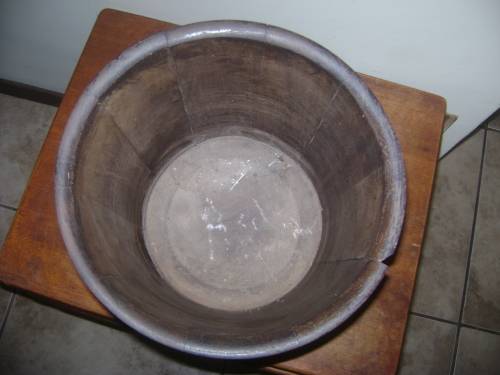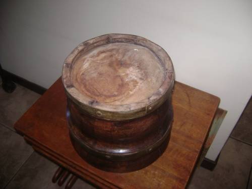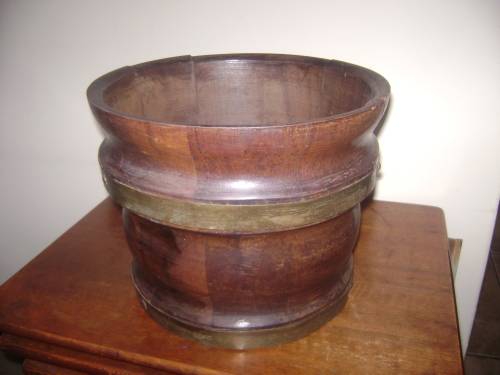 OLD WOODEN POT PLANT HOLDER WITH BRASS RINGS