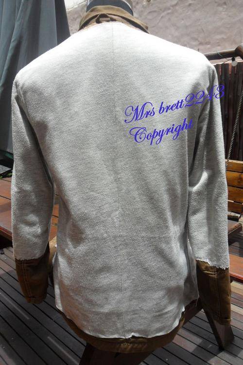 This jacket got a little bit more "houding" than others as it has 1 ou man line on the back of the jacket and the previous owner added a lining obviously for the more colder nights. It does have repaires under each armpit and then of course extra stitching. Oh and there is 1 button missing.