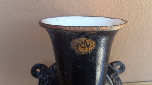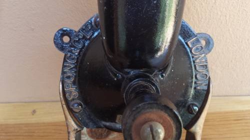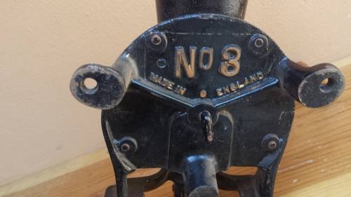 Old Spong No. 8 coffee grinder. Outside still looks good but the inside has taken wear. Blade still good. This grinds coffee beans, pepper corns, etc. Not for meat. This grinder s still in a lovely condition.