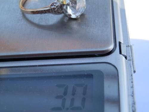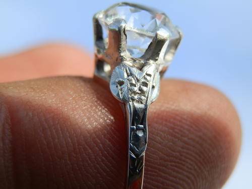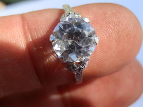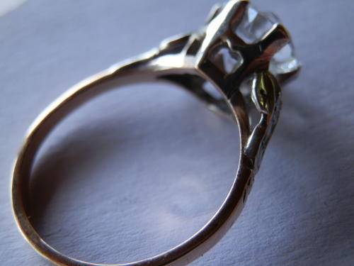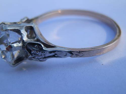Lovely old vintage 9 ct Yellow and white gold sapphire ring, in good condition, marked 9 ct, size Q / 8.5 with a head width of 9 mm and a total weight of 3 g. The white sapphire is 9 mm diameter and of good quality.