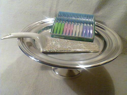 Old Vintage Art Deco Cake Lifter & "1968" EPNS Cake Stand with Retro Cake Forks, in 100% Condition.