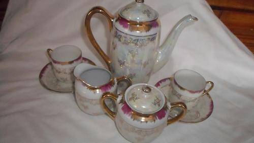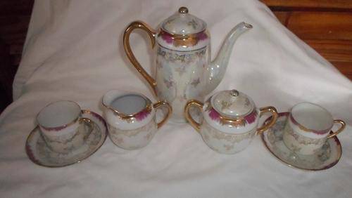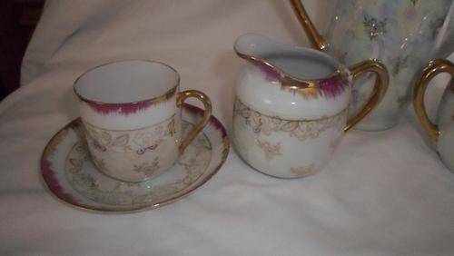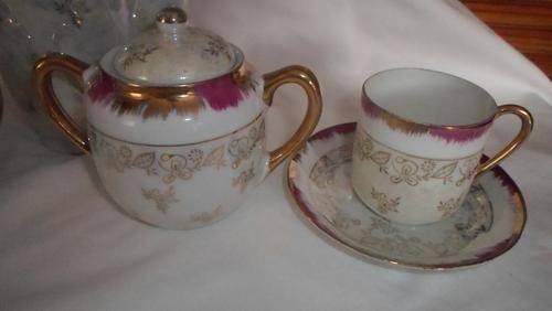 TEA POT SUGAR POT AND CREAMER + 2 X DIMITASSE CUP AND SAUCERS