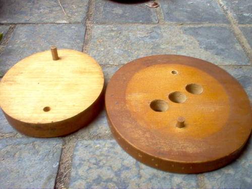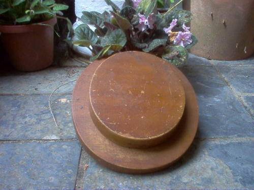 AN OLD WOODEN HAT BLOCK IN THE SHAPE OF A BOATER.THE BASE IS 22.5 BY 20CM AND THE CROWN IS 17 BY 15CM .