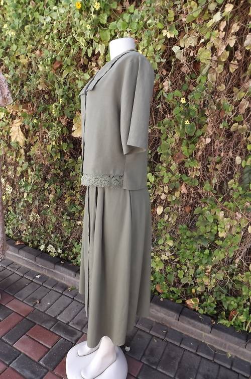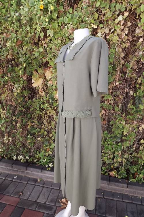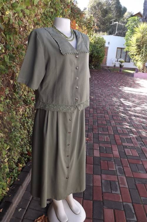 Olive green 2 piece outfit in size 40/16 from TOPICS.Button down skirt pleated front.Cropped top with lace decoration.Button down with wide collar.Polyester/viscose blend fabric.Used but in good condition.