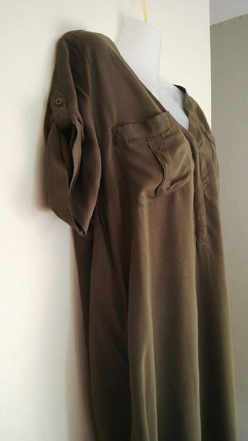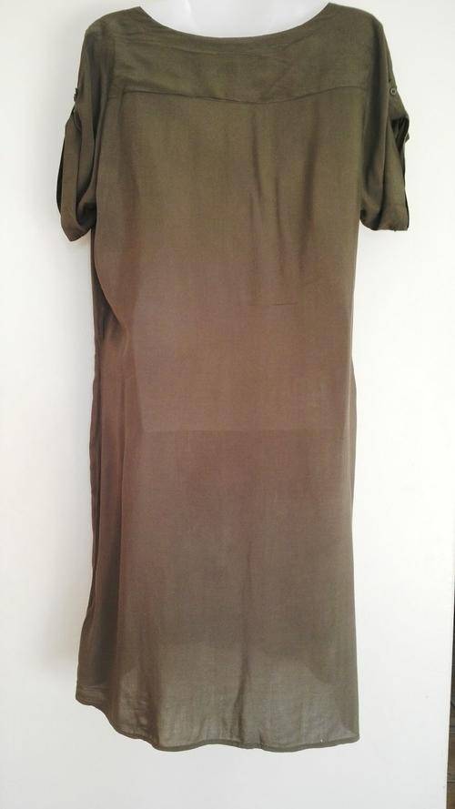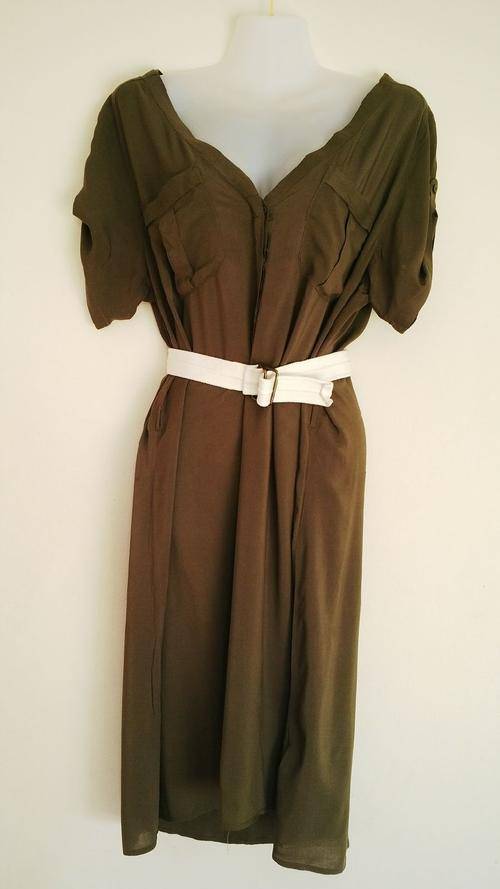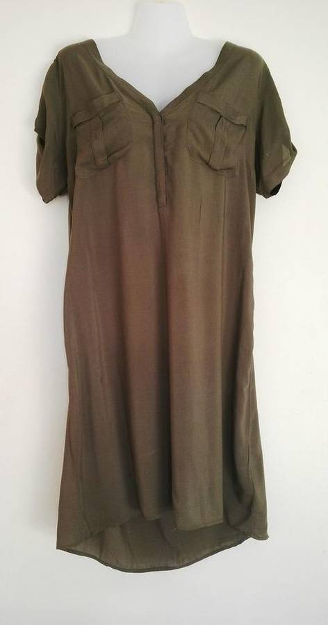 Olive Green shirt dress , silk feel fabric 100%viscose, looks great with or without belt (belt not included) in Very good condition