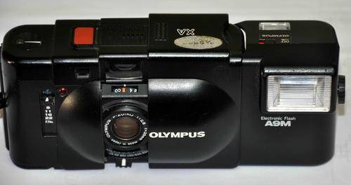 With its unique clamshell design and superb 35mm f2.8 Zuiko lens this is a sought after classic. It uses a split image rangefinder with the shutter speeds indicated on the left hand side of the viewfinder by a needle, The built-in light meter is accurate and everything works as it should. Included is the A9M flash unit especially for the XA.