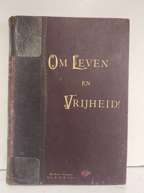 OM LEWEN EN VRIJHEID! GESCHIEDENIS DER OUD-HOLLANDSCHE REPUBLIEKEN IN ZUID-AFRIKA BY C J VAN DER LOO, PUBLISHED IN 1901 BY THE BROTHERS E & M COHEN, IN ARNHEM, HOLLAND. THIS LEATHER-BOUND HARD COVER BOOK IS IN A FAIR PRE-OWNED CONDITION WITH ALL PAGES INTACT BUT WITH SOME AGE RELATED WEAR TO THE COVER (PLEASE REFER TO THE PICS). IT MEASURES 28.5 X 21 CM.