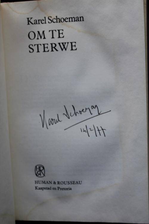 Eerste uitgawe, eerste druk. Uitgegee deur Human & Rousseau in 1976. Boek bevat Schoeman se uiters skaars handtekening maar is ongelukkig regdeur gevlek om die randjies soos per fotos.