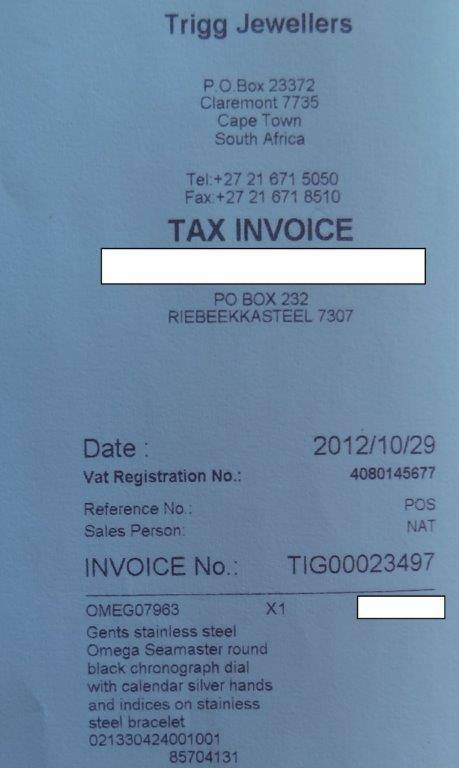 NB. The watch comes with a copy of the original invoice from the Authorized Dealer as well as documentation from The Swatch Group (South Africa) certifying that the watch is under warranty. However, the warranty card that was issued with the watch was incorrect. The serial number on the watch and on the invoice (85704131) is consistent, as attested by Swatch/Omega.