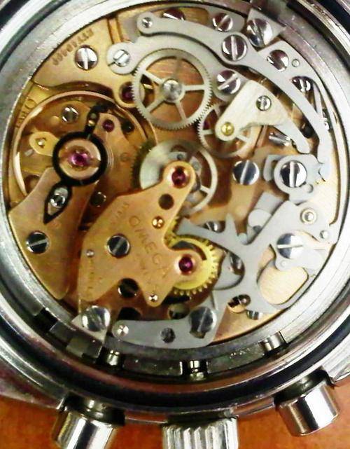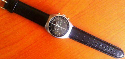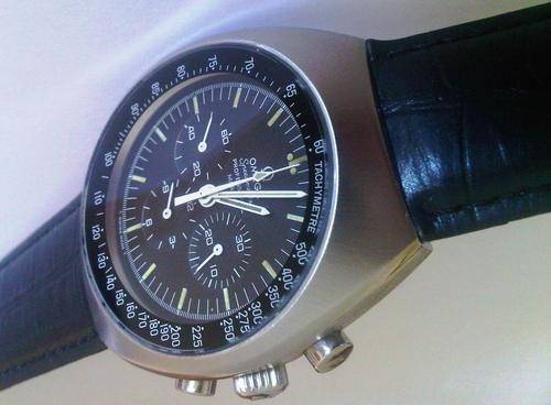 This watch has a very clean movement and black dial and has a complicated mechanical movement and is in a stainless steel case and is fitted with a leather bracelet with an Omega buckle