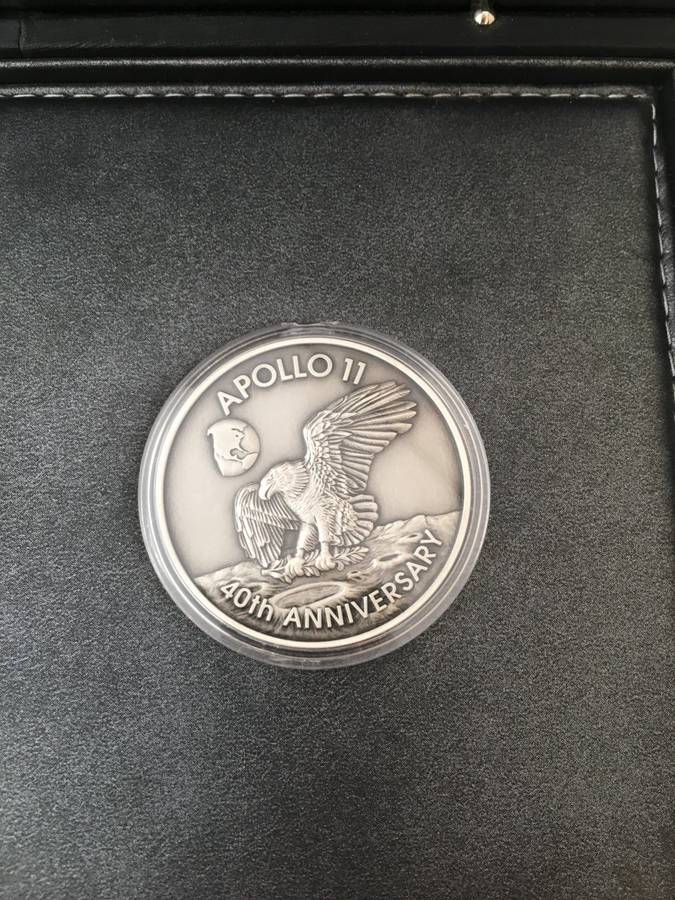 The OMEGA Speedmaster Professional Moonwatch Apollo 11 “40th Anniversary” Limited Edition is delivered in a black presentation box which also includes a 42 mm sterling silver medal (the same diameter as the watch) featuring an engraving of the mission patch on one side with the words “APOLLO 11, 40th ANNIVERSARY”. On the reverse side, the medal is engraved, “THE EAGLE HAS LANDED”; “LAUNCHED JULY 16 1969”; “LANDED JULY 20, 1969”; and “RETURNED, JULY 24, 1969” along with OMEGA’s name and logo. Also in the presentation box is a certificate of authenticity and an envelope containing a black polishing cloth printed with information commemorating the historic space flight.