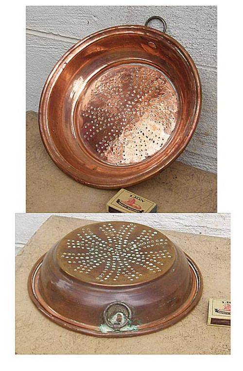 ITEM DESCRIPTION........PLEASE NOTE THIS AUCTION FOR ONE SINGLE COPPER ITEM, PICTURE OF THREE TOGETHER MERELY REFERENCE SHOWING THE COMPARISON OF SIZES AND VISUAL VIEW OF ALL TOGETHER SHOULD A BUYER WANT ALL THREE.........REALLY NICE AND SELDOM SEEN.....POSSIBLY EARLY CAPE VINTAGE OR ANTIQUE SOLID COPPER DISHED......SIEVE OR COLANDER WITH CAST METAL HANGER RING IDEAL TO HANG ON THE WALL OR POT STAND. THIS IS THE SECOND LARGEST OF A SET OF THREE GRADUATED SIZES.......SEE THE OTHER TWO EXAMPLES ALSO LISTED SEPARATELY. NO MAKERS MARKS SEEN ON THIS, BUT TOP QUALITY CRAFTSMANSHIP AND FOLDED SOLID RIMS.