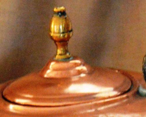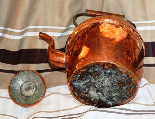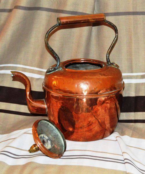 The handle was finished with Brass fittings and the kettle is a stove top teapot shape. The copper teapot from the bottom to the fop of the handle stands 310 mm high. From the bottom to the bottom of the lid, 180 mm and from the bottom to the top of the lid holder 220 mm high.The widest diameter of the copper teapot is 200 in diameter.
