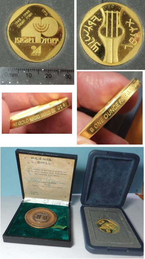 The 22ct gold medal comes with a second medal (struck in bronze) that was awarded in 1971 to Mr. & Mrs. L. Shill of South Africa by Dr. Israel Goldstein, the then Chairman of Keren Hayesod United Israel Appeal. Louis Shill was the South African Minister of Housing and Public Works in the previous century in the cabinet of F.W. de Klerk. He collected gold medals as we have a receipt for an 18 carat gold Jan van Riebeeck medallion that he bought via Standard Bank from the Africana Commemorative Mint on 7 December 1977. The gold Mafeking Siege Medallions we currently have on auction, also belonged to him.