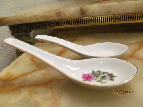 2)- PORCELAIN SPOON REST WITH GOLD TRIM AND DECORATED WITH FLORAL PATTERN - NOT STAMPED - 13.8cm LENGTH .....5cm WIDTH OF BOWL.....1.5cm WIDTH OF HANDLE REST