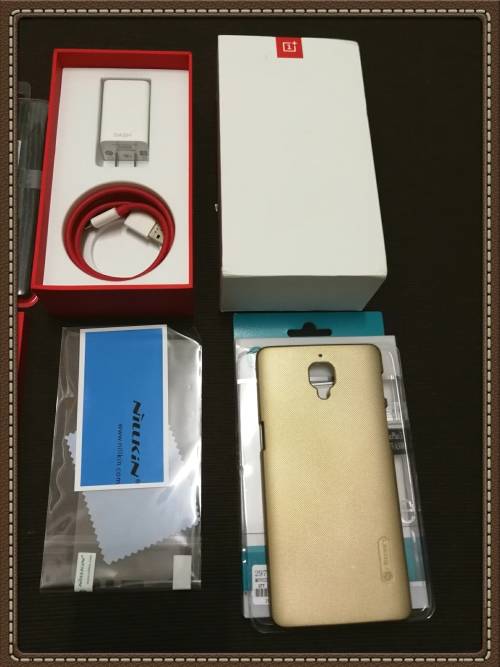 OnePlus 3 device with original box and Dash Charger and cable , manuals and sim pin . Also included are a Genuine OnePlus 3 Cover and a Genuine Spigen cover as well as 2 new screen protectors as well .