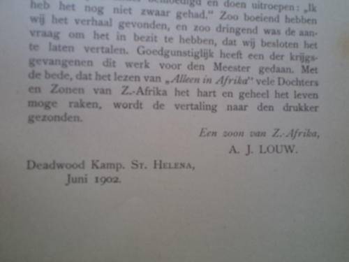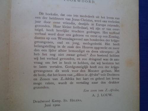 (SABIB: Vol.II, p. 379: three repositories only). Eersgenoemde inligting dui die uiterste skaarsheid van hierdie boekie aan. Wat dit nog waardevoller maak, is dat die bekende ds. A.J. Louw wat tydens die Anglo-Boereoorlog die Boere-krygsgevangenes in die Deadwood-kamp te St. Helena bearbei het, hierdie boekie vertaal het uit Engels. Die boek is in in redelik-goeie toestand. Die rugkant is beskadig, asook die hoekpunte. Daar is 70 bladsye en ook `n paar swart en wit foto's. Datum van uitgawe is 1902.