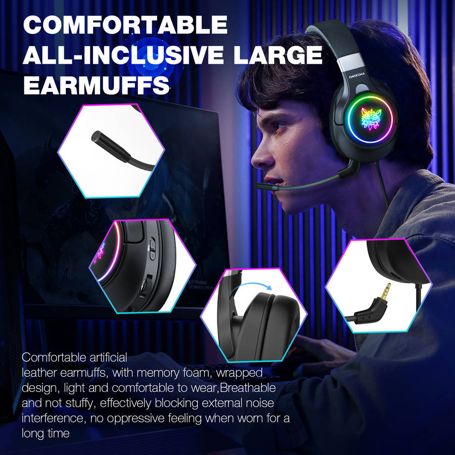 Features: Foldable Gaming Headset Both side of the earmuffs of ONIKUMA gaming headset can be folded inside the headband and the microphone is detachable, making it easy to carry. Ergonomic Design The ONIKUMA foldable gaming headset adopts ergonomic design and uses lightweight material, and its earmuffs use artificial leather and memory foam, giving you comfort without any oppressive feeling. Noise Canceling & Detachable Microphone The foldable gaming headset can easily stop all noises coming from outside, which helps you efficiently communicate using the microphone. If you do not want to talk between games- just switch the mic off then you can have your me-time with the game, or you can remove the mic as it is detachable Stereo Surround Sound With 40mm magnetic neodymium driver technology , the headset will help you hear your rivals inching close in PUBG focus on the movie dialogues. For both music and games, the headphones will help better Specification: Model: ONIKUMA K15 Speaker Size: 40mm Sensitivity: 108+/-3db Microphone: 4.0*1.5mm Impedance:32Omega+/-15% Cable Length: 2.2M+/-15% Directionality: Omi-directional Microphone Impedance: 2.2k Frequency Range: 20Hz-20 KHz LED Working Voltage: DC5V Microphone Sensitivity: -38+/-1dB Working Current: headset Jack: USB+3.5mm 4Pin Cable length: Approx. 2.2m Package Content: 1 * Gaming Headsets 1 * Splitter Cable 1 * User Manual