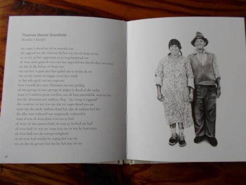 “ONSE MENSE” is a book consisting of 22 charcoal drawings by Marie Stander. Each drawing is accompanied by a poem that was specifically created for it by one of 22 different poets. The people depicted in the drawings are from Jamestown, Stellenbosch. The original drawings are life-size and has been reduced to the format of the book.
