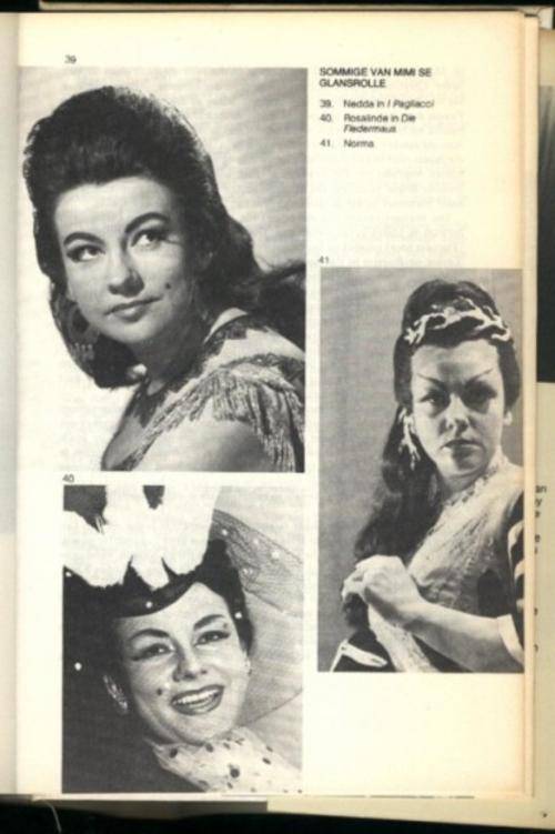 Book description: Biography of opera singer and stage performer Mimi Coertse. Text in Afrikaans. White boards. 242 pages including numerous B&W photos.