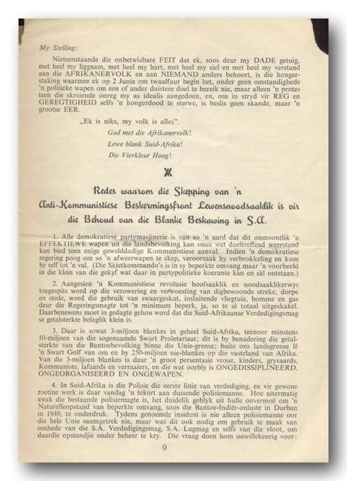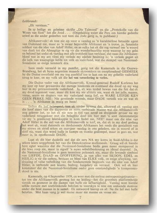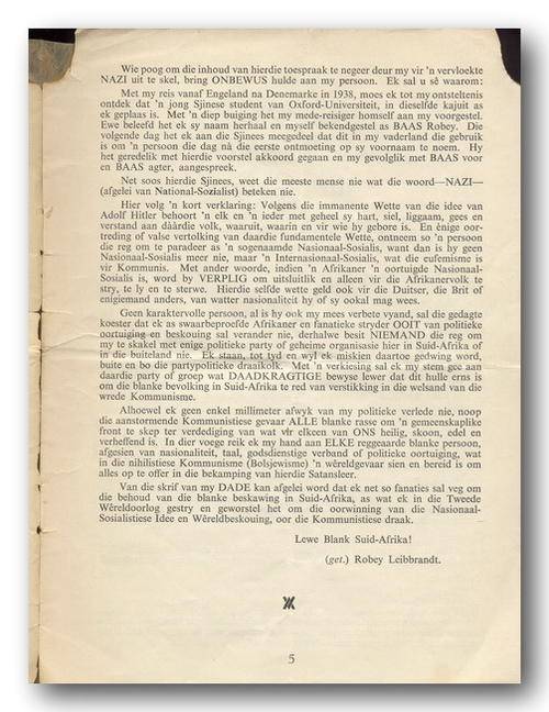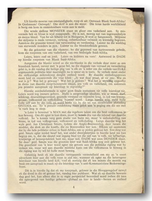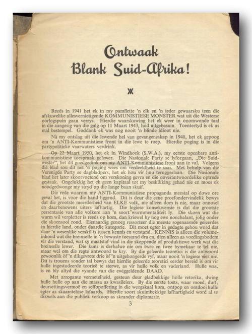 Ontwaak Blank Suid-Afrika deur ROBEY LEIBRANDT. "Staple"-boekie, 14 bls, 165x225mm. Boekie se boonste hoeke is afgeskeur en uiteblad is met kleefband aanmekaar geplak. Alles is leesbaar met een bladsy in kantlyn 2 strepe om inligting aan te toon.