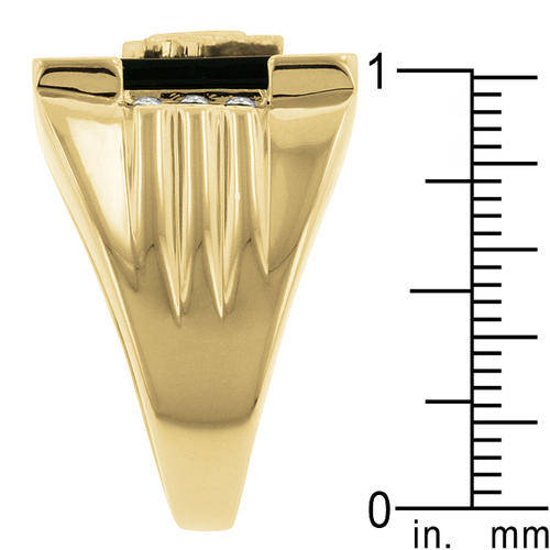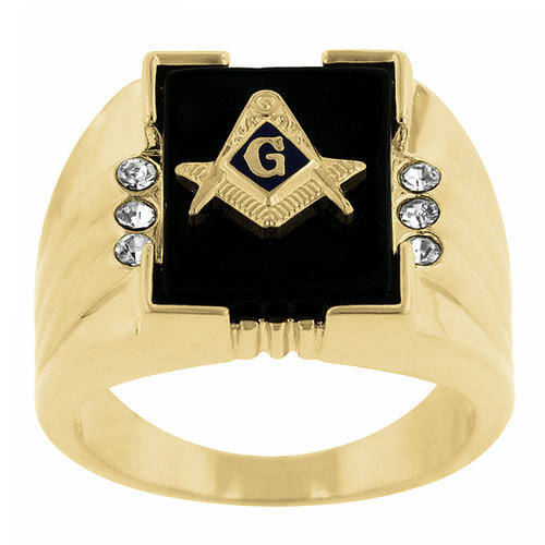 18k Gold Plated Ring with Masonic Symbol with Onyx Accents with Round Cut Clear Cubic Zirconia Accents on the Side Polished into a Lustrous Goldtone Finish