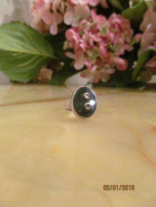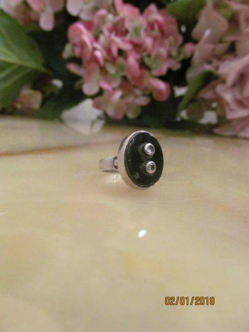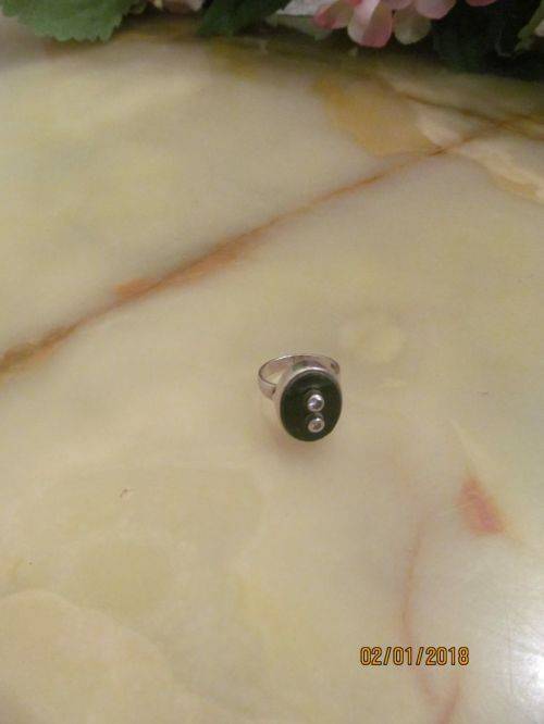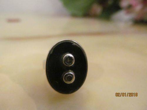 THE RING IS SILVER WITH AN OVAL SHAPED SILVER TOP INSIDE WHICH A POLISHED BLACK ONYX STONE IS INSERTED. A PAIR OF SILVER MOUNTS PROTRUDE THROUGH THE ONYX AND EACH HAS A SPARKLING CUBIC ZIRCONIA OR CRYSTAL INSERT.