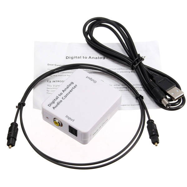 Optical Digital Coaxial Toslink Signal To Analog Audio Converter Adapter DC 5VDescription:This Digital to Analog Audio Converter is designed for either home or professional audio switching. It converts coaxial or toslink digital audio signals to analog L/R audio and available for connection to an external device such as an amplifier via standard RCA jacks.